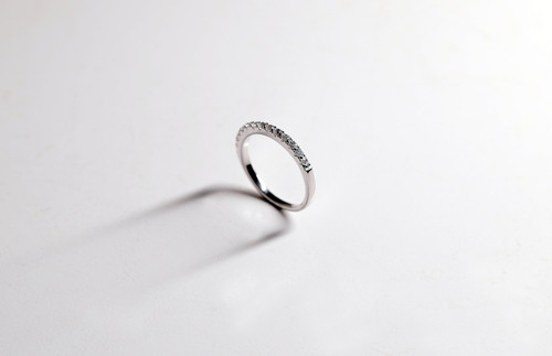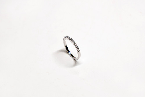 The Radiant Arc Band is an elegant ring crafted from 925 sterling silver with a rhodium plating for lasting shine. It features a graceful arc of sparkling solitaire gemstones that adorn the band, creating a sense of flow and movement. The subtle yet eye-catching brilliance of the gems captures light beautifully, emphasizing the ring's sophisticated design and timeless appeal.